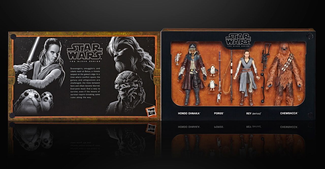 pack contrebandier et fuyards comprenant Hondo ohnaka , Rey , Chewbacca ,et des porgs