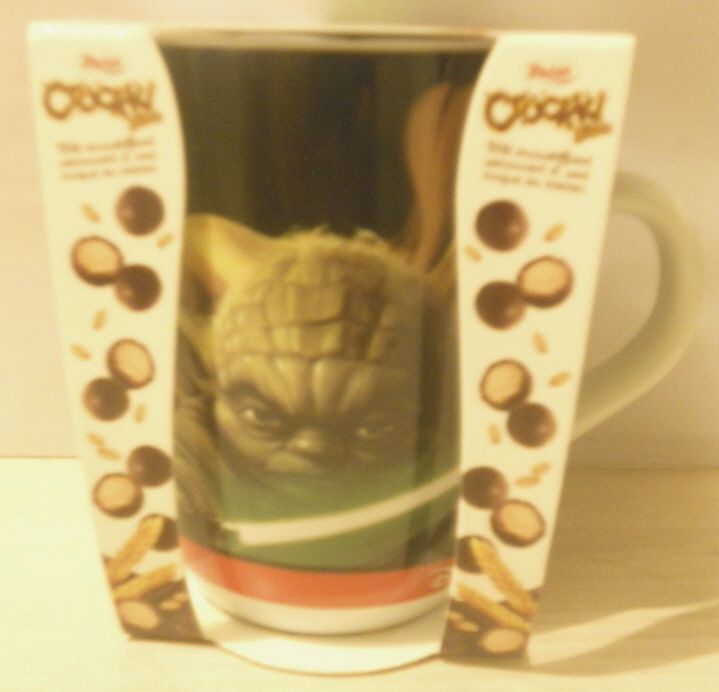 trouvé chez E.Leclerc, une tasse/Mug Yoda-Dark Vador , sur fond Blanc , en céramique, avec un petit paquet de bonbons au chocolat