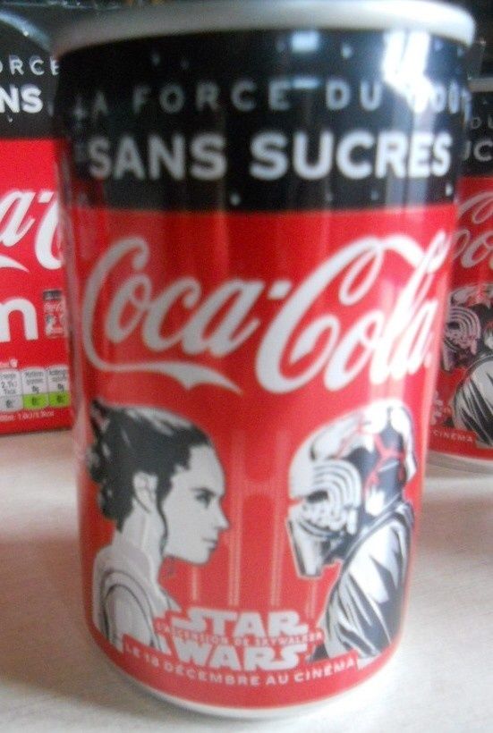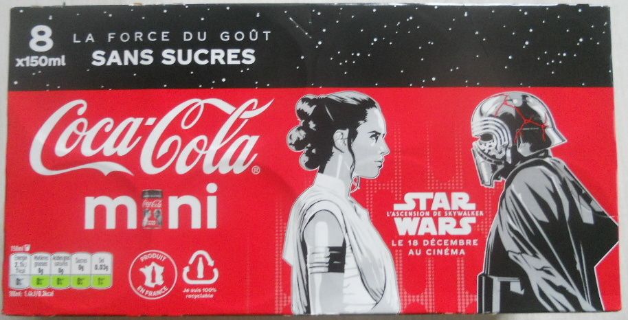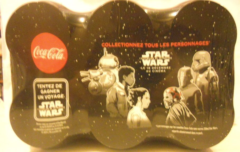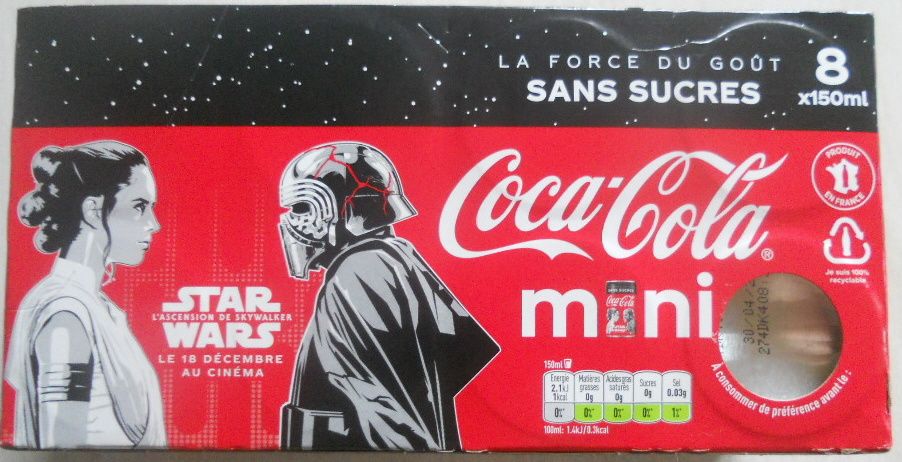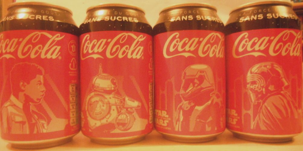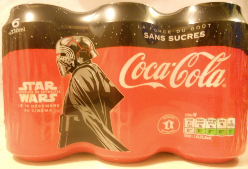 Coca-Cola a sorti une série Limitée de 6 cannettes commémoratives à l'occasion de la sortie en décembre de Star Wars épisode IX L'ascension de Skywalker. Ces 6 Cannettes sont dans la Gamme Zero/Sans sucres , par 6 , par 9 ou par cartons. les pack commencent à arriver en Magasins. Les cannettes sont distribuées de manières aléatoires dans les Packs